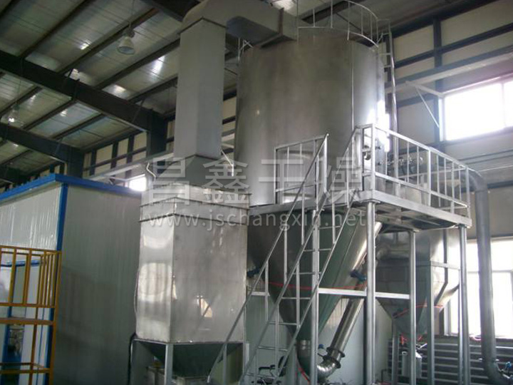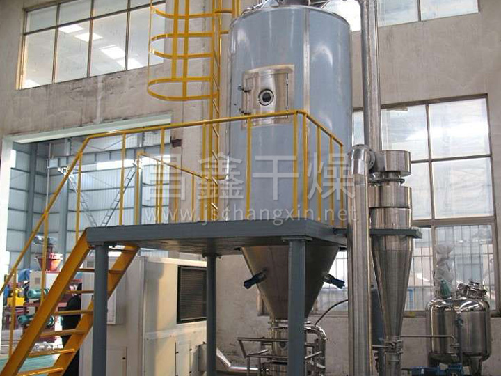 空气经过滤和加热,进入干燥器顶部空气分配器,热空气呈螺旋状均匀地进入干燥室。料液经塔体顶部的高速离心雾化器,(旋转)喷雾成极细微的雾状液珠,与热空气并流接触在极短的时间内可干燥为成品。成品连续地由干燥塔底部和旋风分离器中输出,废气由风机排空。